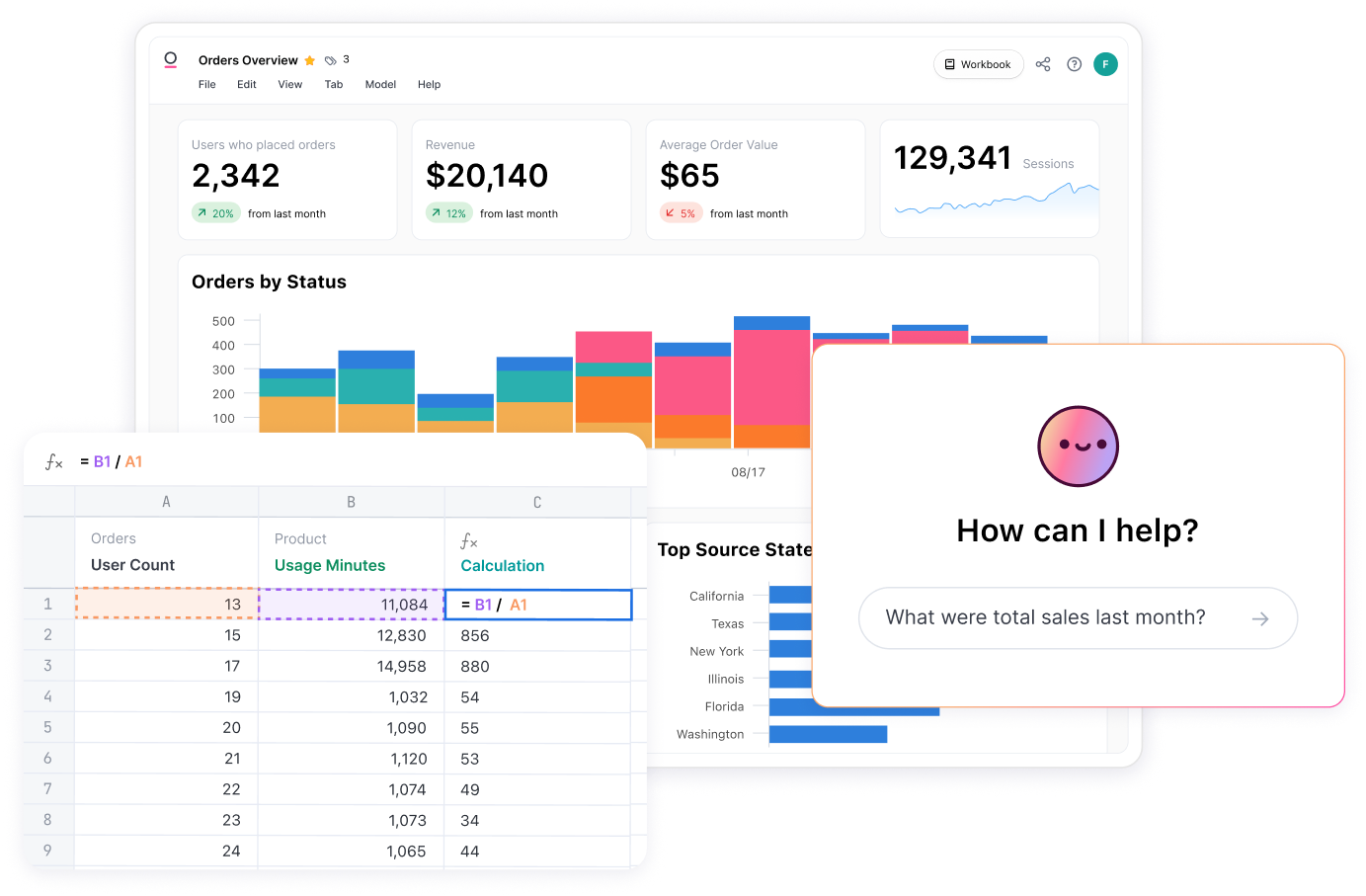 Give users the power to build their own analyses with AI, Excel calcs, SQL, or a point/click UI — right inside of your product.