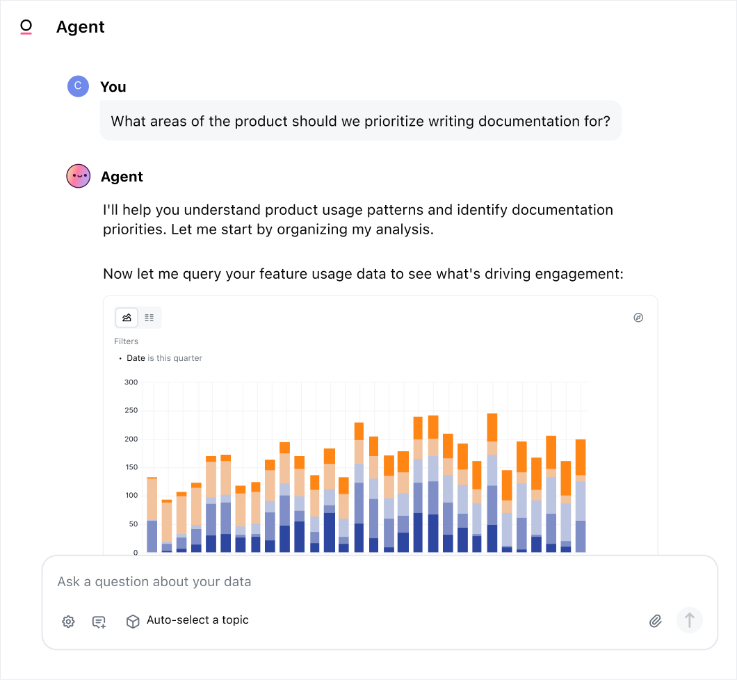 Ask follow-up questions about anything you see. Or generate fully formatted dashboards with a prompt — so you can go from idea to shareable insights in seconds.